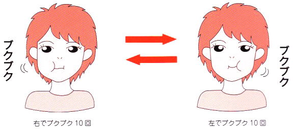 上下の歯をかみ合わせたまま、右で10回ブクブクブク、左で10回ブクブクブク、左右別々にブクブクうがいします。