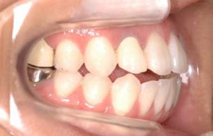(なお、この方は、24才から矯正治療を開始しました。マルチブラケット装置を約3年間装着し、この間は1か月に1回定期的に通院していただきました。治療費は、約90万円かかかっています。矯正歯科治療のリスクである歯根吸収はありませんでしたが、歯肉が少し下がり若干歯が長く見えるようになりました。この方は、顎間ゴムをきちんと装着すること、口のトレーニングを継続的に続けることなどが、きちんと治すためには必須条件でしたが、とても一生懸命に矯正治療に取り組まれ、それを継続していただけたおかげで、このように治すことができました。)