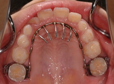 上の写真の開咬の患者さん、タングクリブという、舌を前に出せないようにする矯正装置を装着しました。